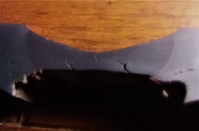 I have already posted about the martensitic phase transformation that occurs during quenching of a knife blade in earlier posts. Another way to achieve a similar phase change in steel is through shock hardening. A shock wave is introduced into the steel through the contact of an explosive charge detonating on the steel. The resulting stress wave, if at high enough stress levels, transmitted in the steel induces the phase change. The resulting phase change left behind can be brought to light by polishing and etching a sectioned portion of the witness plate. The transformed material will show up darker in natural light and can be seen in the photograph.